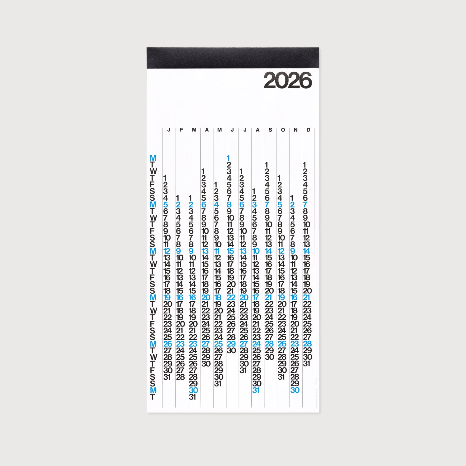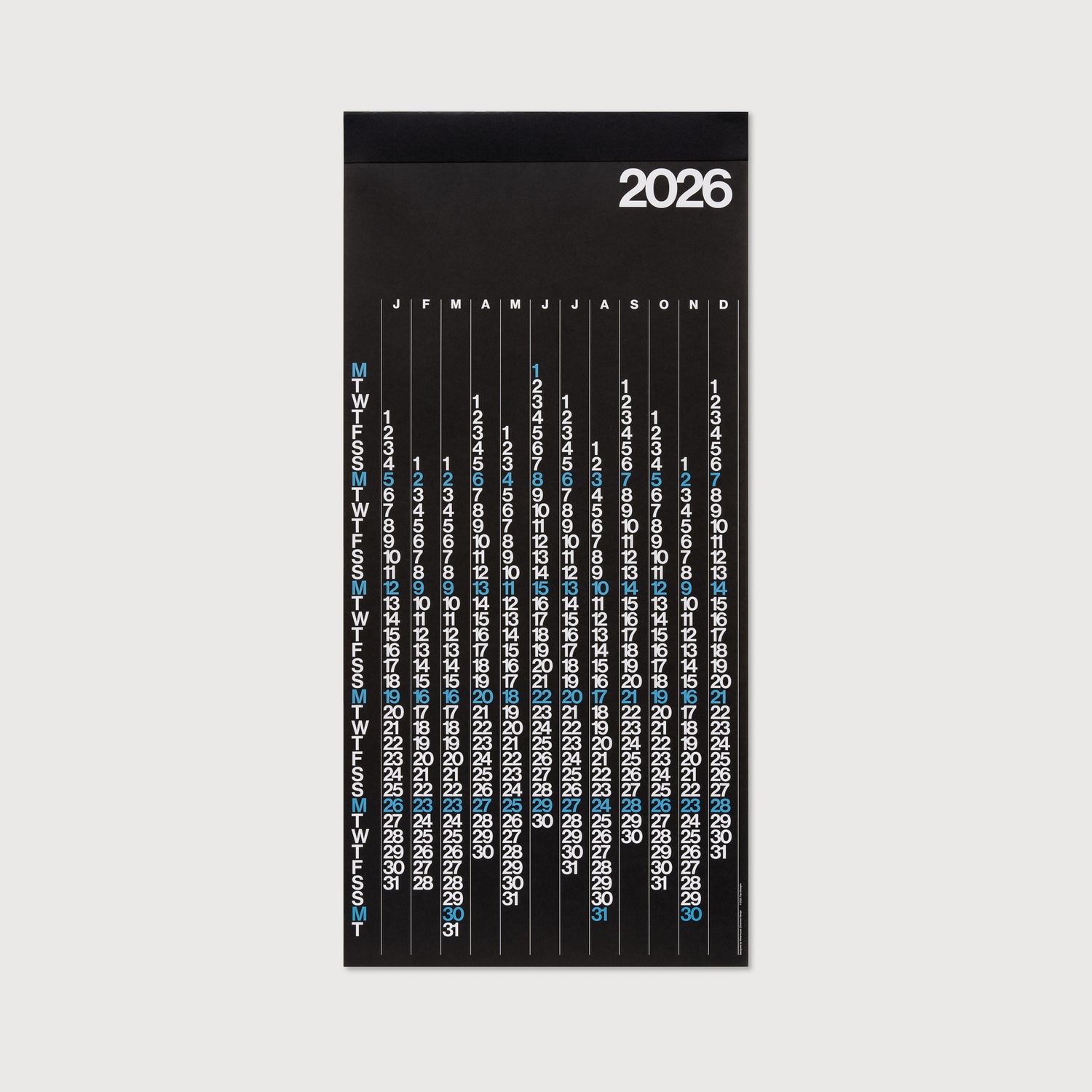 Unlike the Stendig, the V Calendar changes colour every year. The V’s designers, Yoshiki Waterhouse and Beatriz Cifuentes have mapped out a multiyear sequence of colourways. Each colour set in the series is designed to look beautiful on its own, but also to compliment the years that come before and after, following on in a harmonious progression.